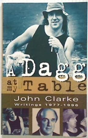 A Dagg at my Table. John Clarke (aka Fred Dagg) Writings 1977-1996. Dagg, Frederick, Dip. fencing (Hons), PhD in Cattle (Oxen), Advisor and Comforter to the Government and People of Australia. Born: 1948. Educated; Subsequently, Served in the Armed Forces during French and Science. Travelled extensively throughout the Holy Lands, then left New Zealand for Europe, 1971. Held important positions with Harrods, Easibind, John Lewis, Selfridges etc 1971-72. Escaped (Decorated) Rejoined Unit. Arrived Australia 1977. Held positions with ABC Radio (Scd), ABC Television (Dfnct), Various Newspapers (Dcd), and Aust. Film Industry (Fkd). Currently a Freelance Expert specialising in matters of a general character. Recreations: Reading theological works, dog trials and orpingtions, Address: c/- The people next door or just pop it inside the door of the fuse box. Should be back Friday'. The book has light to medium general wear sadly a coffee stain on the last two pages but still readable. Tight and bright.
