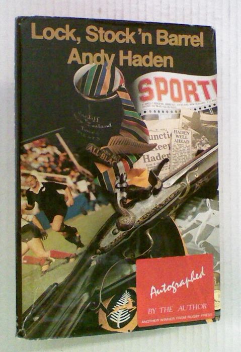 Lock, Stock'n Barrel by Andy Haden. When Andy Haden completed work on Boots'n all in 1983 he believed he had worthily encapsulated the game's major issues. It would be, he felt, many. many years before a sequel needed writing. But scarcely had Haden rested his pen then sensation followed sensation. He was summoned before the NZRFU to answer charges of professionalism - forcing him to opt out of the 1984 All Black tour of Australia; He became embroiled in the fated 1985 All Black tour of South Africa; He participated in the infamous Cavaliers tour of South Africa; He captained Auckland to Ranfurly Shield glory on Lancaster Park; He suffered dismay at what he terms the continuing mixture of incompetence and secrecy that surrounded the game's decision makers. Lock, Stock 'n Barrel is another stimulating, enlightening and outspoken book by a phenomenon of the rugby world. 'Personal signed by Andy Haden. The dust jacket has medium general wear with tape repairs and creasing. The book remains tight and bright.