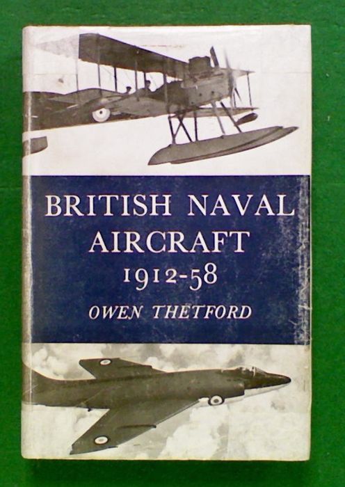 British Naval Aircraft 1912-58 by Owen Thetford. 'This is the first complete reference book to all aircraft ever flown in regular service by the Naval Wing of the Royal Flying Corps, the Royal Naval Service and the Fleet Air Arm. There are over 360 photographs and over 100 three view drawings.' The dust jacket has much wear with tape repairs, creasing and scuffs. Price is unclipped. The book remains tight and bright.