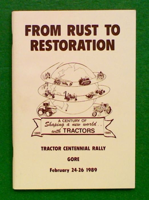 From Rust to Restoration. Tractor Centennial Rally Gore February 24-26 1989. Edited by John A. Cutt. 'Few people would doubt that agriculture holds a special place for New Zealand and even under the present depressed economic climate is still the country's number one earner of much needed overseas export earnings. Because of a generally favorable climate and topography, New Zealand has been a world leader in many areas of land based production - from scientific research to animal breeding and stock and pasture management. In commissioning this booklet, the Southern Tractor Centennial Committee has attempted to record in brief summary, some of the main makes and models of tractor that helped to shape the future of mechanise farming in the world's industrialized nations, and more importantly, the contribution of those machines and the men who sold and worked them here in New Zealand, and in the south in particular.'