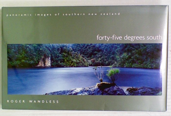 Forty-Five-Degrees South by Roger Wandless. From his Panoramic Images of Southern New Zealand Series. 'A unique and personal photographic journey of the lower South Island, centred on the 45th parallel. The results of over 10 years living in and photographing the region, it features outstanding images, depicting stunning natural beauty, diversity and human influences in the region.' The book dust jacket has some light creasing and a few bumps but overall a tight and bright copy. A LARGE BOOK THAT MAY REQUIRE ADDITIONAL FREIGHT.