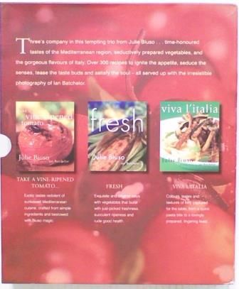 Julie Biuso Three Cooking Book Set. Three's company in this tempting trio from Julie Biuso... time-honoured tastes of the Mediterranean region, seductively prepared vegetables, and the gorgeous flavours of Italy. Over 300 recipes to ignite the appetite, seduce the senses, tease the taste buds and satisfy the soul - all served up with the irresistible photography of Ian Batchelor. Book 1 - Take a Vine-Ripened Tomato. Book 2 - Fresh. Book 3 Viva L'italia. All the book contain many Vegetarian recipes. A LARGE SET of BOOKS THAT WILL REQUIRE ADDITIONAL FREIGHT.