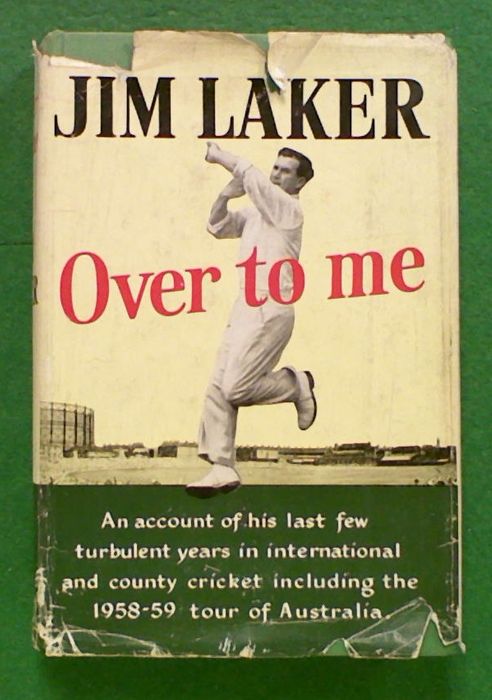 Over to Me: An Account of His last few Turbulent Years in International and County Cricket by Jim Laker. 'This is Jim Laker's own account of his last few turbulent years in English abd international cricket, and in particular of the 1958-59 tour of Australia. He tells how, after being passed over for years, he was finally chosen to play for England in Australia, and how he nearly did not go because of a difference with his skipper Peter May.' The dust jacket has much wear with missing chips and curling and tape repair but the book remains tight and bright.