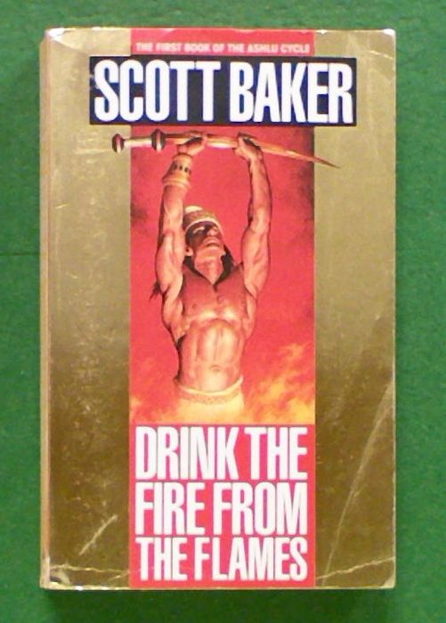 Drink the Fire from the Flames by Scott Baker. 'An ancient world of mystery, ritual, magic. . . Moth, a young potter, has betrayed his guild and his potter's soul to become a smith. Now he is a man with two warring souls, tortured, possessed - and his burning desire to revenge the hideous enslavement and murder of some of his family adds to his lonely burden.'
